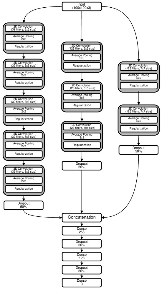 The proposed multi-branch architecture was composed of three separate branches, each designed to capture different levels of abstractions, as shown in Figure 4. The first branch incorporated convolutional layers with a 3 × 3 kernel size and an average pooling size of 2 × 2. Five convolutional blocks were instantiated, generating 32, 64, 128, 256, and 512 filters, respectively. Post-convolution, the data were flattened and subjected to a 50% dropout.