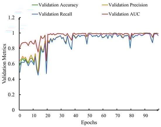 Figure 5 shows the performance of our model against the validation set. The metrics plotted include accuracy, precision, recall, and area under the curve (AUC), each providing a comprehensive view of the model’s diagnostic prowess. These metrics are widely used in ML and classification tasks to assess the performance of models. Each metric serves a specific purpose and provides valuable insights into different aspects of a model’s predictive capabilities. The x-axis represents the number of training epochs, capturing the iterative optimization process. As a model iteratively learns from the data, its diagnostic capabilities evolve, and the corresponding performance metrics showcase this progression. The y-axis represents the percentage value of each metric, reflecting the proportion of correct predictions and successful classification. The presented metrics offer distinct perspectives on the model’s performance: