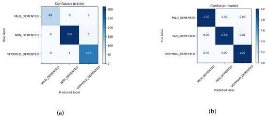 Our neural network achieved an accuracy of 99.05% as depicted in the confusion matrix shown in Figure 7a,b. Of our 637 test images, only 6 were misclassified, with all of these images belonging to the non-demented and very mild demented classes, as shown in Figure 7a,b. We found that our neural network did not overfit and that the validation accuracy ceased to improve after about 100 epochs. However, increasing the size of our model did not yield any increase in accuracy.