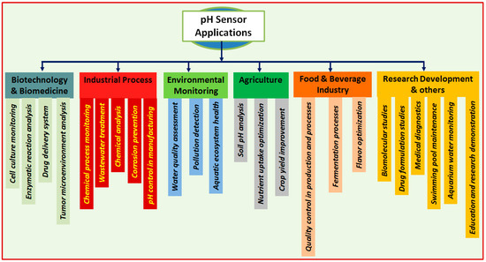 In the current nanotechnological age, pH detection has become fundamental because of its potential functionalities in different fields, providing basic data about the perceptiveness or alkalinity of an answer. Since pH is a critical component in numerous synthetic, organic, and ecological cycles, it is imperative to measure pH precisely and routinely for various applications [1,2,3,4,5]. In the areas of biotechnology and biomedicine, pH detection is fundamental for observing cell exercises, enzymatic responses, and medication conveyance systems. It allows us to upgrade and improve cell development conditions, assess the successes of remedial mediations, and explore the pH-subordinate behavior of bio-atoms. pH sensors are normally used to screen and control the pH of culture media, guaranteeing ideal circumstances for cell development and efficiency in different applications, including biopharmaceutical creation, tissue designing, and maturation processes. For instance, in malignant growth treatment, cancer microenvironments are often portrayed by acidic pH because of expanded glycolysis and lactate creation. pH sensors can be utilized to quantify and screen the pH levels in growing tissues, helping with the assessment of treatment adequacy and reaction. By following pH changes, analysts and clinicians can acquire important experiences in the adequacy of pH-delicate anticancer treatments, such as pH-actuated drug conveyance frameworks or pH-responsive imaging specialists [6,7,8,9,10]. In environmental observation, pH sensing is used to assess the strength of amphibian biological systems, evaluate water quality, and identify contamination sources. It supports the comprehension of normal cycles like corrosive downpour development, sea fermentation, and the effect of modern releases. pH detection is likewise fundamental in the food and drink industry, where pH levels determine item well-being, quality, and flavor. Observing and controlling pH during maturation processes, food safeguarding, and blending is fundamental for guaranteeing item consistency and the period of usability. Moreover, pH detection plays a crucial role in various applications, including agriculture, by enhancing soil pH levels to promote efficient nutrient uptake by plants and prevent soil degradation. It is also important in industrial contexts for process control, including chemical reactions, wastewater treatment, and erosion prevention. The efficient and cost-effective control of these operations is made possible by accurate pH assessment, assuring optimal performance and reducing environmental impact. Researchers, businesses, and conservationists can use pH detection as a useful scientific tool in a variety of disciplines to obtain knowledge, make choices, and address problems with productivity, sustainability, and health [2,8,9,10,11,12,13,14,15,16,17]. As technology continues to progress, pH sensors are becoming more advanced, accurate, and user-friendly, allowing for more precise and real-time monitoring of pH levels in various applications. One of the main drivers for the future growth of pH sensors is the increasing demand for more precise and reliable measurement techniques. Another factor is the development of new materials and technologies that enable pH sensors to be used in harsher and more demanding environments. The pH sensor market is expanding rapidly due to several key factors. For example, the food and beverage industry is increasingly focusing on ensuring food safety and quality throughout the supply chain. pH sensors play a vital role in monitoring and controlling pH levels in food and beverage processing, preserving product quality and shelf life. In emerging economies, infrastructure development, rapid industrialization, and increasing investments in sectors such as water treatment, healthcare, and manufacturing are driving the demand for pH sensors in these regions. In a healthcare context, miniaturized development of pH sensing devices and their validation with biological samples could see these devices applied in the medical field, especially in situations where current glass electrodes cannot be used due to fragility and size constraints. For example, gastrointestinal reflux disease requires pH monitoring and diagnosis is currently conducted using endoscopy. However, developing compact pH sensing devices in capsules can help retrieve data through wireless signaling from the sensor without any medical intervention to smart devices such as smartphones, which can transmit the data to a server in cloud networks for health service providers to access for their service. Figure 1 shows a schematic presentation of pH sensor application areas.
