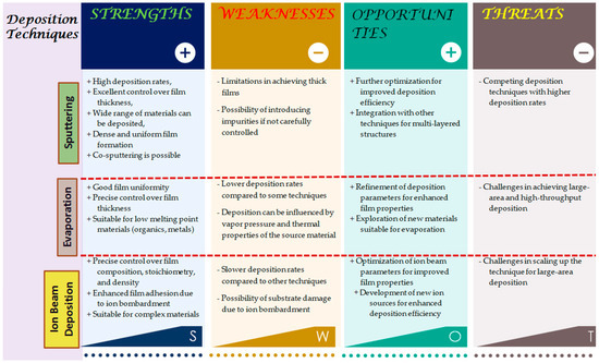 SWOT analysis of sputtering, evaporation, and ion beam deposition techniques that are commonly used for thin film preparation. Note: This SWOT chart is a synopsis of thin film deposition techniques. However, specific advantages and limitations may vary depending on the deposition system, process parameters, and materials used.
