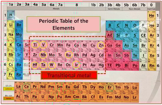 The group of materials that are frequently used to design and synthesize pH sensors/sensing devices using PVD techniques is presented in the periodic table schematically. Note that most of the metal oxides used in the last decade for pH sensor development belong to the transition metal group, as indicated by the yellow and green circles in this periodic table presentation.