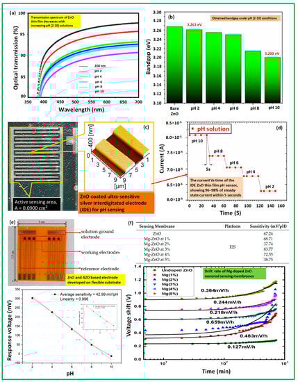 A glimpse of ZnO-based pH sensing electrode development: effects of pH on the optical properties of ZnO film (a), thus leading to determine the pH dependence of the bandgap of ZnO film (b); photolithography-assisted developed ZnO-coated ultra-sensitive silver integrated electrode (IDE), and the steady-state current response performance with different pH solutions (c,d); development of and performance comparison in terms of average sensitivity for ZnO and aluminum doped ZnO (AZO)-based pH electrodes (e), and the sensitivity improvement on Magnesium (Mg)-doped ZnO pH sensing electrodes (f) [47,50,51].