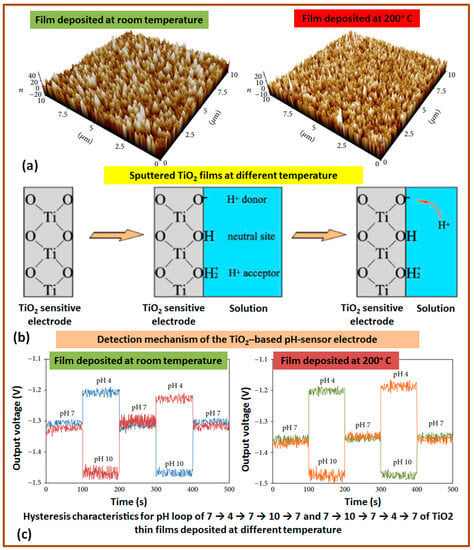 TiO2-based pH sensing electrodes development: microstructure evaluation of TiO2 films deposited at different temperatures (a), working principle of TiO2-base pH electrode (b), and the observed effects of deposition process parameters (such as film growth temperature) on the hysteresis characteristics of pH loop (c) [54,56].
