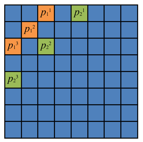 We embed the watermark bits with the quantization method [32]. In every block, we can embed 2 bits of information and for every bit, we modify three parameters to embed. As a result, we will change 6 parameter values for every block. Assume that the parameters’ positions for bit 1 are and those for bit 2 are , as shown in Figure 2.