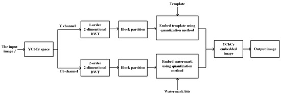 The watermark embedding process mainly includes two parts: information embedding and template embedding, which are performed in the Cb and Y channels, respectively. The information embedding process includes a two-order/two-dimensional DWT, block partition, block DCT, and coefficient quantization. The template watermark is a sequence with 256 bits. And the template watermark embedding process is almost the same as the information embedding process, except we replace the two-order DWT with a one-order DWT for the reason that the lower level DWT can reduce the number of head searching points so we can extract the watermark faster. The detailed embedding process is as follows: