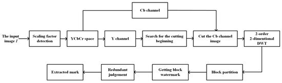 Robustness, imperceptibility, capacity, and computation complexity are the main factors we should consider when we design a watermarking scheme. In order to obtain a better robustness, we transform the image into the YCbCr color space and apply DWT to obtain the more stable low frequency data. What is more, we divide the image into blocks and repeatedly embed the same input watermark. As to the imperceptibility, we carefully select the parameters in the scheme, including the DCT positions to be embedded and the quantization value . We also choose a proper size of blocks to make this scheme have enough capacity. In addition, multiple processes are also applied to the extracting scheme in order to reduce the computation complexity. Figure 5 and Figure 6, respectively, display the detailed embedding and extracting schemes, and the specific processes are described in Section 3.1 and Section 3.2, respectively.