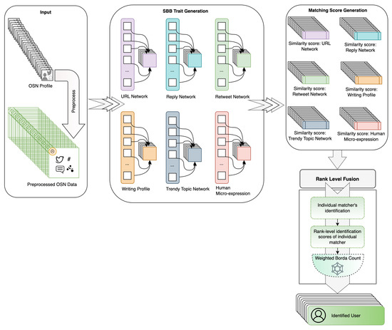 The initial input to the proposed method is the online social network (OSN) profile of a user. This profile, comprising a variety of user data, undergoes an initial preprocessing stage, where the crucial pieces of information that hold relevance to the identification process are extracted. The data is then passed on to the SBB trait generation stage, where the data is transformed into a set of SBB traits. These traits, constituting the essence of the user’s social behavior, provide the fundamental data upon which the identification process hinges. Moving forward, the extracted SBB traits are then used to generate matching scores, which are subsequently fused to produce a final decision score. For score fusion, a rank-level Weighted Borda Count [34] technique is applied to the matching scores produced by each SBB trait. The final decision score is then used to identify the user. The details of each of these stages are discussed in the following sections.