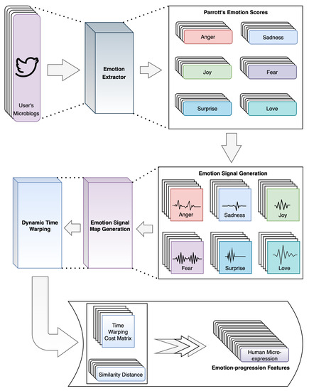 Following this, a novel algorithm described in [11] constructs emotion signals and corresponding emotion-signal maps for each of Parrott’s primary emotions. In particular, the emotion scores of a sequence of 50 microblogs with their temporal orders are considered to construct a single emotion signal [11]. Essentially, these emotion signals serve as representations of the sequence of emotion probability scores for each OSN user’s microblogs [11]. Correspondingly, emotion-signal maps denote pairs of emotion signals, purposed for similarity feature extraction. Once the emotion signals and their corresponding emotion-signal maps are constructed, the Dynamic Time Warping (DTW) algorithm [33] is employed to extract the similarity features from the emotion-signal maps. The similarity features, time-warping cost matrix, and similarity distance, then collectively form the human micro-expression SBB trait unique to each OSN user [11].