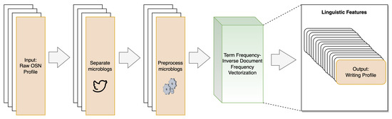 The Writing Profile SBB trait, as presented in [10], explores a user’s linguistic patterns, including word choice, grammar, and sentence structure, to discern distinctive writing signatures [10,44]. Figure 4 depicts the workflow of extracting the linguistic features.