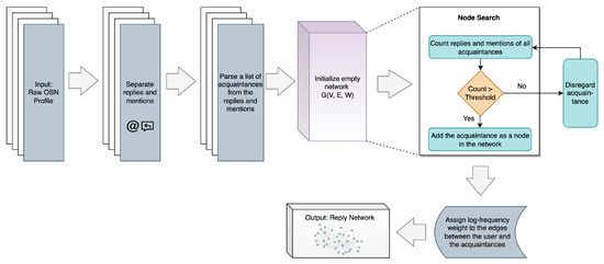 The Reply Network, initially introduced in [9], is a pioneering SBB trait that detects statistical patterns in the frequency of OSN users’ responses to their virtual acquaintances, in the form of replies and mentions [9]. The process of reply network generation is depicted in Figure 5.