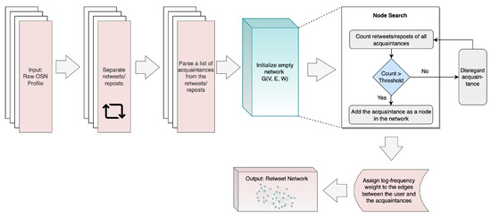 Initially, retweet and repost data are extracted from the raw OSN profile. A list of acquaintances is then derived from this data, and a weighted retweet network is established based on the retweet or repost relationship between an OSN user and their connected acquaintances. Analogous to the Reply Network, acquaintances comprise the nodes, while the user represents the edges. Nodes are created after counting the retweets for each acquaintance and determining whether a specified threshold has been met. Edge weights are assigned according to the logarithmic frequency of retweeting or reposting events between a node and an edge, with Equation (1) employed for calculating log-frequency. Finally, the algorithm generates a weighted retweet network as its output.