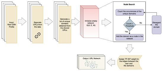 Figure 7 demonstrates the methodology for constructing the URL network for OSN users. To start, the shared URLs are extracted from the OSN profile of a user, and a list of unique domains shared by the user is compiled from these URLs. The URL network is then assembled based on the shared domains and their frequency [9,44]. In this network, each unique domain serves as a node, while the user represents the edge. A domain is added as a node only if the number of occurrences for that domain meets a predetermined threshold [9,44]. In the final step, the Term Frequency–Inverse Document Frequency (TF-IDF) vectorization technique [42] is employed to calculate the weights of the edges, resulting in the completed URL network [9,44].