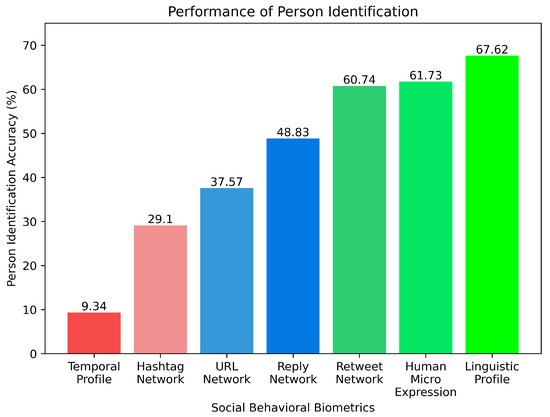 In this section, an analysis of the individual Social Behavioral Biometrics (SBB) traits’ performance is conducted. According to the methods described in [9,10,28], the original retweet network, reply network, URL network, hashtag network, temporal profile, and linguistic profile for all available users are constructed. The results of person identification by standalone performance of the SBB characteristics are shown in Table 1. In the context of existing SBB methodologies, this analysis provides insightful information on the efficacy and potential of human micro-expression SBB trait to enhance multimodal SBB systems’ overall person identification performance if integrated.