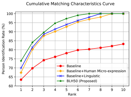 In addition to time efficiency, a compelling rank-wise accuracy comparison of the recently introduced human micro-expression and the linguistic profile, as depicted in Table 3, further demonstrates the superior performance of the human micro-expression SBB trait, while the linguistic profile holds a slight edge in rank-1 accuracy with 67.62% versus the human micro-expressions’s 61.73%, the human micro-expression SBB trait begins to outperform the linguistic profile from rank-2 onwards. It achieves a higher rank-2 accuracy of 77.45%, compared to the linguistic profile’s 76.23%.