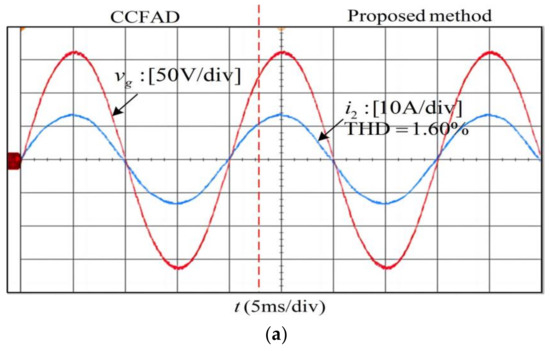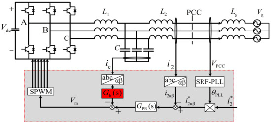 Figure 2 depicts the per-phase block diagrams of the LCL-type, grid-tied inverter system with CCFAD. i2 is the measured grid current; is the command grid current which is set according to the system request; ic is the measured capacitor current, and the inverter is modeled as a linear gain KPWM with one and half sampling period digital delay Gd(s) which is composed of a computation delay and a modulation delay. The expression of Gd(s) is given as follows [39]: