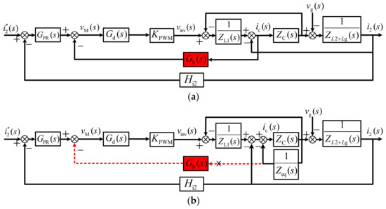 Block diagrams of inverter with CCF active damping. (a) Initial one. (b) Equivalent one.