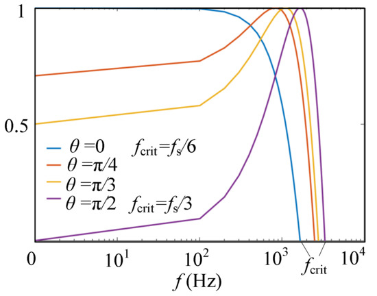 As shown in (8), when θ changes from 0 to π/2, fcrit increases from fs/6 to fs/3. Figure 4 plots the frequency region of Req(ω) being positive as θ changes. Especially, taking the two boundary values into account, it is seen that when θ = 0, fcrit = fs/6, and when θ = π/2, fcrit = fs/3. Therefore, the EDR obtained is [0, fs/3) according to (8).