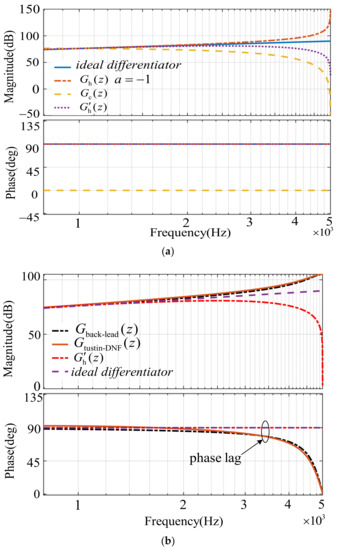Figure 5 depicts the zero-pole distribution of Gh(z), in which there is a zero z = 1 and a pole z = a, and the pole a slides on the real axis within the range (−1, 1), which corresponds with each different lead phase angle θ within the range (0, π/2). As of Gh(s), the two boundary values 0 and π/2 are not available. However, unlike the Gh(s), the parameter a of Gh(z) can change within an extended range [−1, 1]. Gh(z) simplifies to H and fcrit = fs/6 in the case of a = 1, which is just the conventional CCFAD, and it can be attained that Gh(z) = H (z − 1)/(z + 1) in the case of a = −1, which is similar to the Tustin discrete form of an ideal differentiator. As seen in Figure 6a, the ideal differentiator can provide π/2 phase lead compensation and finite gain over the entire frequency domain, but can not be implemented in practice. On the contrary, Gh(z) (a = −1) can achieve the same phase-lead compensation and be easily realized in the digital-control system, but infinite gain arises at the Nyquist frequency, which is more likely to amplify the figure high-frequency noises. In order to overcome the drawback of Gh(z) (a = −1), this paper proposes a strategy of cascading a digital low-pass filter with it.