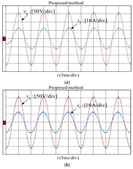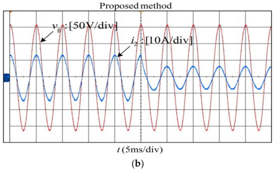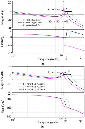 Figure 9 illustrates the frequency response of the two methods mentioned above, which is affected by the variation of the grid inductance Lg. For the case C = 9.4 μF and Lg = 0 mH, the original resonant frequency fr is equal to 2.01 kHz, which is a little above and close to fs/6. As shown in Figure 9a, when method 1, namely Gh(z) = H, is applied, referring to the curve 1, the forward-path phase transits through −180° at fs/6 and fr, respectively. The requirement of the gain margin GM1 < 0 at fs/6 and GM2 > 0 at fr must be met to ensure the system stability according to the Nyquist stability criterion. When Lg varies from 0 mH to 0.8 mH dynamically, the actual fr will get closer to and finally be approximately equal to fs/6. Obviously, it can be seen from curve 2 in the plot that the two frequency points fs/6 and fr are so close (almost overlap) that the requirement of the gain margin GM1 and GM2 cannot be met simultaneously or the value of GM1 and GM2 are not adequate to ensure system robust stability. When Lg increases further up to 2.0 mH, fr thus shifts below and away from fs/6. The forward-path phase transits through −180° only at fr, and the system goes back to the stability state again in case the requirements for PM and GM1 are met simultaneously, as illustrated by curve 3 in the plot. As shown in Figure 9b, when method 2, namely Gh(z) = H(z − 1)/(z + 1) is applied and Lg varies within the range (0, 2 mH), the forward-path phase transits through −180° once at the frequency below fs/3, for which the system stability can be guaranteed only when the requirements for PM and GM1 are met simultaneously.