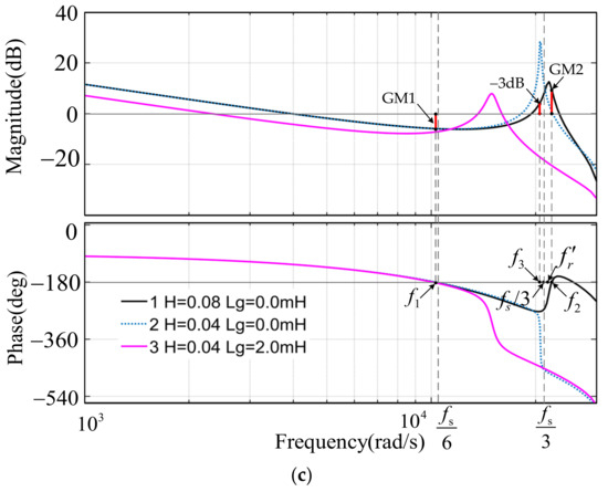 For the case C = 3.9 μF and Lg = 0 mH, the resonant frequency fr is equal to 3.12 kHz, which is a little below and close to fs/3. Applying method 2, referring to Table 2, when the coefficient H < H3 mentioned in the previous section, Req(fr’) is positive and the forward-path phase transits through −180° only at the frequency f1; when the coefficient H > H3, Req(fr’) is negative and the forward-path phase transits through −180° at f1 and f2, respectively, as illustrated by curve 2 and curve 1 in Figure 9c. However, one crossing point through −180° will be gone and curve 1 turns into curve 3 (Lg = 2.0 mH) eventually when Lg changes from 0 to 2 mH.