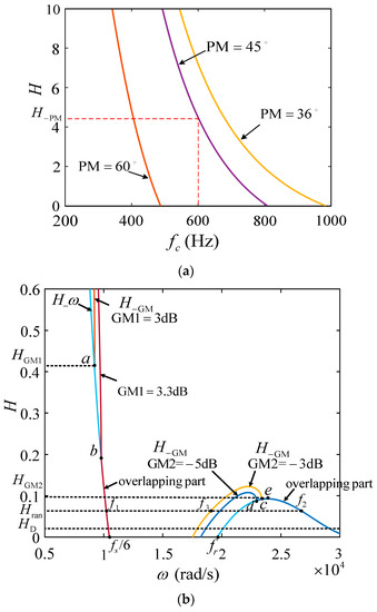 In order to obtain the constraint of the gain margin GM on H, the crossing frequencies f1 and f2 should be solved first. However, different from the CCFAD whose crossing frequencies are fixed at fs/6 and fr, it is hard to obtain the solution of f1 and f2 from (31) due to the crossing frequencies f1 and f2 for the proposed method varying with H. According to the definition of GM, (32) is deduced, which denotes that for given H, the corresponding frequency points satisfy the design requirement of GM.