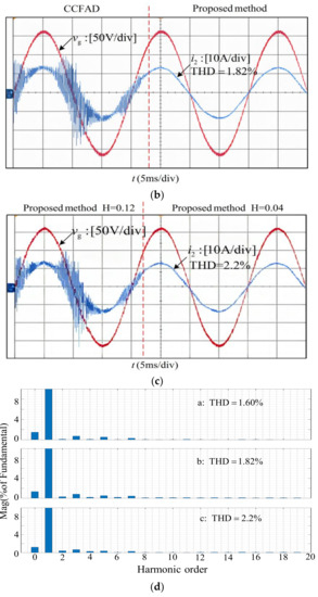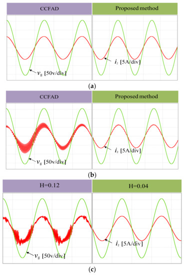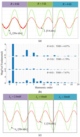 Parameters used for simulation and experiment are given in Table 4, where two different capacitor values are chosen to generate different filter resonance frequencies on the condition that convert-side inductance L1 and grid-side inductance L2 are selected unchanged. For the weak grid, the grid inductance Lg may change from zero to the maximum value available, which is chosen corresponding to the short circuit ratio (SCR) of 10 [5]. Compared with the inductance, the commercial capacitors are more accurate and well-tested; therefore, changing the capacitor’s value for analysis is a preferable choice to inductance value.