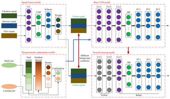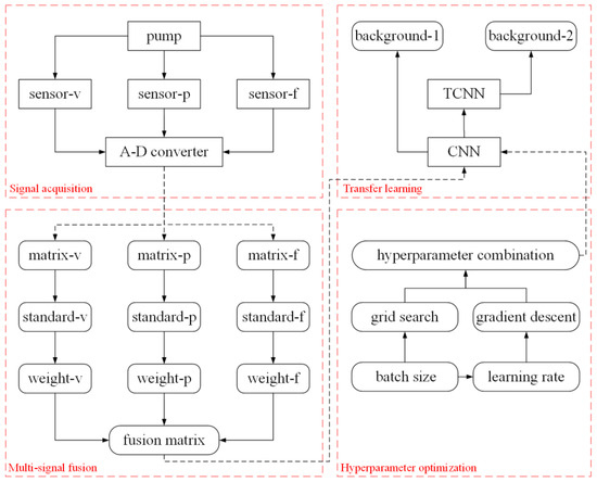 To solve these problems, a novel framework for a model named Hyperparameter Optimization Multi-Signal Fusion Transfer Convolution Neural Network (OMTCNN) is proposed in this paper. A new transfer-based convolutional neural network model is first designed to promote well-learned knowledge transfer over different background conditions for improving robustness and generalizing the model in cross-domain diagnosis tasks. Then, the multi-signal fusion strategy is involved to capture the state information of the pump for establishing the mapping relationship between the raw signal and fault pattern by integrating the multi-physical signal with the weight allocation protocol. Afterward, a hyperparameter optimization method is explored to arm with the transfer learning model by integrating Grid Search with the Gradient Descent algorithm for further improving diagnosis performance. By doing this, the OMTCNN model can effectively realize the fault diagnosis of pumps under different background conditions.