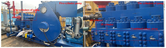During the operation of the pump, the background conditions, such as the stroke of the pump and the pressure of the pump, will change. The stroke of the pump is mainly maintained at 90 strokes per minute (SPM) and 110 SPM, and the pressure of the pump is mainly maintained at 20 Mpa and 40 Mpa. The conditions of the stroke of the pump and the pressure of the pump can be divided into four situations: 90-20, 90-40, 110-20, and 110-40. In this paper, these four situations correspond to A, B, C, and D conditions. Vibration sensors, pressure sensors, and flow sensors are used to collect the relevant signals from the 1# cylinder and the 2# cylinder of the pump under A, B, C, and D conditions. The signal collection of the five-cylinder pump on site is shown in Figure 6.