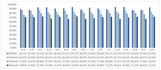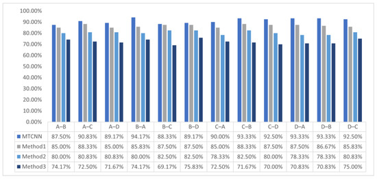 It can be observed that the MTCNN model has certain advantages in fault diagnosis accuracy compared to other transfer network models in the internal transfer of the 1# cylinder under A, B, C, and D conditions. Further experimentation uses the MTCNN model through transfer learning to diagnose faults in the A, B, C, and D conditions of the 1# cylinder, also using any background condition as the source domain in the 2# cylinder and other background conditions as the target domain in the 1# cylinder. And compare it with other transfer network models shown in Figure 9.