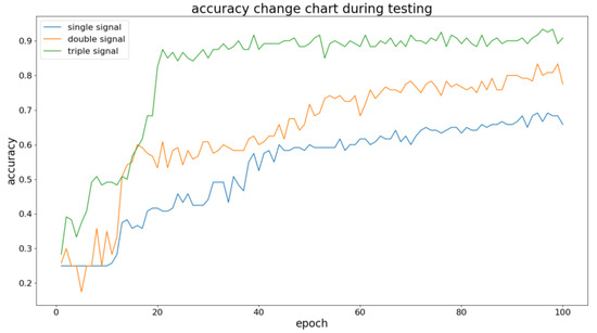 It can be observed that, compared with other methods, the MTCNN model ensures computation efficiency in the process of fault diagnosis. And if only considering the fault diagnosis results of the internal transfer of 1# cylinder and the transfer from 2# cylinder to 1# cylinder under A, B, C, and D conditions, the MTCNN model achieves optimization based on the TCNN model. In addition, the MTCNN model was used to further test the fault diagnosis results using different types of signals, as shown in Figure 10.