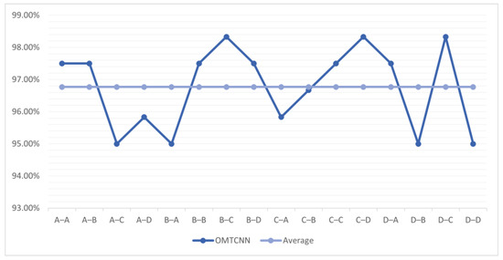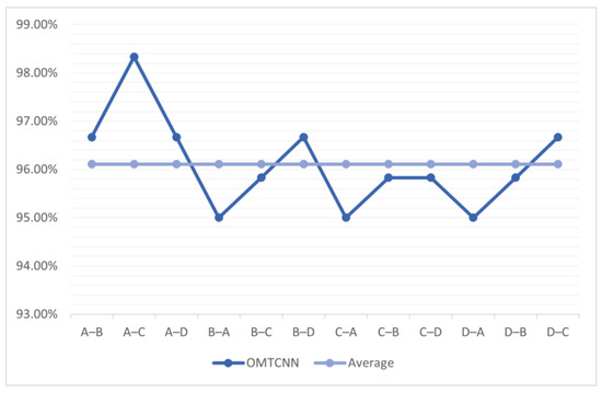 In order to verify the optimization results of fault diagnosis through the introduction of the hyperparameter optimization module, this experiment uses the OMTCNN model to diagnose faults through transfer learning within the 1# cylinder under A, B, C, and D conditions, using any background condition as the source domain and other background conditions as the target domain. The OMTCNN model has added a hyperparameter optimization module on top of the MTCNN model, and its parameter configuration is consistent with the MTCNN model. The accuracy of OMTCNN under A, B, C, and D conditions of internal transfer in a 1# cylinder is shown in Figure 11.