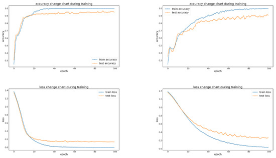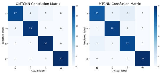 It can be observed that OMTCNN leads MTCNN in relevant statistical indicators. In order to further explore the potential performance improvement of the OMTCNN model compared to the MTCNN model, as shown in Figure 13 and Figure 14, the confusion matrix obtained under the same experimental limitations and the corresponding training process were analyzed. The confusion matrix represents four types of fault status, namely N, S, R, and W. Each fault status contains 30 samples.