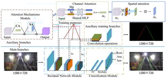 27], and other methods have been designed with a method based on the line anchor, which uses a linear relationship between the sampling points and the preset offsets and regresses to derive the lane lines with the highest level of confidence using NMS as a constraint. The above methods have an excellent performance ability in most of the scenes, and the scene distribution is mostly based on sufficient illumination and rich image contrast. The performance ability for scenes with weak illumination, a simple texture, and low contrast will be reduced, resulting in lower detection accuracy.