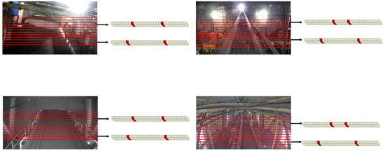 The belt edge location prediction requires a line anchor for the area of the image where the belt is located. The anchors are selected from the main area of the image where the belt is located, i.e., the area where the belt edge features are relatively prominent, up to 70% of the image height. Scientific and reasonable row anchor delineation can help to predict the belt edge location more accurately, reduce the number of computational parameters, and reduce model complexity. The row anchor delineation in different scene images varies according to the position of the belt in the image, as shown in
