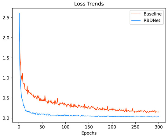 Table 4, it can be deduced that predicting the belt edge position and utilizing the belt edge structure loss with the attention mechanism contribute to enhancing the performance. All three operations exhibited positive effects on the overall accuracy. Notably, the combined utilization of these improvements demonstrated the most substantial enhancement in algorithm accuracy. This outcome further validates the RBDNet effectiveness and reliability. The training loss line graph is shown in