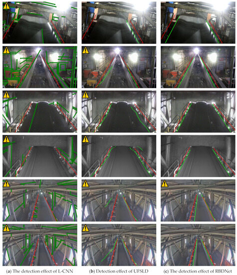Figure 6, it can be concluded that UFSLD has limitations in accurately detecting the belt edge line under inadequate lighting conditions and in regions where the features were not obvious. In Scene 2, although the light conditions were good and UFSLD used a second-order difference constraint, the extracted belt edges appeared as irregular curves, causing deviations in the position of some edge points and leading to false alarms, which affected production. Despite similar metrics to RBDNet in
