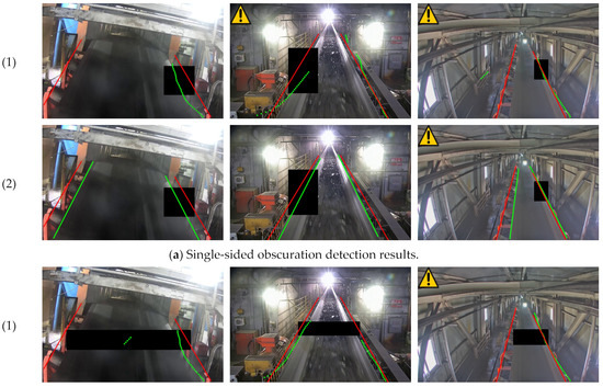 Section 3.2.3, which has a relatively good detection effect, was used to carry out the comparison experiments with two different forms of black areas instead of the shading of the belt edge by foreign objects of different sizes and the shading of the belt edge by the limbs or shadows of people. The detection effect is shown in