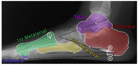 When assessing flat feet from X-ray images, several Points of Interest (PoIs) should be hypothetically allocated and connected to form different foot angles. These angles are then measured and compared at certain intervals to precisely estimate the flatness of the foot as well as its severity level. According to the literature, there are many different foot angles that can be used in diagnosing flat feet; some of these angles can be measured from a certain view, such as a lateral X-ray view where the smallest toe is clearly visible [8,9,10]. Three of the most commonly used foot angles in adult flat foot assessment are: Calcaneal Inclination Angle (i.e., Calcaneal Pitch), Arch Angle (i.e., foot arch), and Meary’s Angle (i.e., Talus-First Metatarsal Angle), as shown in Figure 1 [11,12,13,14,15]. The figure shows nine PoIs allocated (white dots). The angles formed by connecting these points are: (A) the Calcaneal Inclination Angle (CIA), which measures the tilting degree of the Calcaneus bone, aka the heel (in red), using the Sesamoid bone as its base (in blue); (B) the Arch Angle (AA), which measures the tilting degree of the fifth Metatarsal, aka the smallest toe (in yellow); and (C) Meary’s Angle (MA), which measures the tilting of both the Talus (in purple) and the first Metatarsal bones (in green).