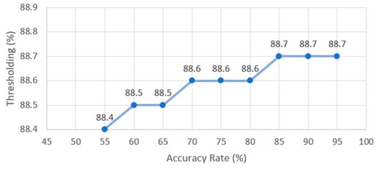 Several trials were conducted to select the Template Matching method that achieved the best similarity score. Among the six Template Matching methods, TM_SQDIFF_NORMED is selected with a threshold value of 90%. The thresholding value was selected after comparing different values from 50% to 95%; the comparison results are represented in Figure 4. The overall accuracy rate represents the mean similarity rate between the resulted image part and the correct image part that was manually selected (the ground truth) using the formula: