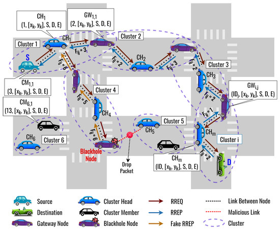 Security is a critical issue in VANETs due to the potential for serious accidents. A blackhole attack that disrupts the data transmission process by dropping all the packets instead of forwarding them is especially serious [11,12]. When other nodes try to communicate with the destination, the blackhole node sends fake route replies (fake-RREP) by having the freshest and shortest or most efficient route towards the destination node [13,14]. However, instead of forwarding the packets to the actual destination, the blackhole node intentionally drops or discards the packets. As a result, the data packets are lost, and the source nodes never receive any response from the destination node. This interruption in data transmission can lead to a significant disruption in communication within the network and causes an increase in the end-to-end delay and low packet delivery ratio (PDR).