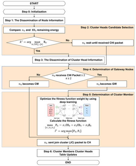 The proposed clustering protocol is called the DLC protocol as an underlying structure, as shown in Figure 2. The proposed DLC protocol uses a DNN model to optimize the fitness function weights for selecting a CH to follow by a CM. Here, we consider three factors to form a cluster, namely, cosine similarity, cosine distance, and remaining energy. Figure 3 shows the flowchart of the proposed DLC protocol. The procedure for forming a cluster and electing the CH is as follows: