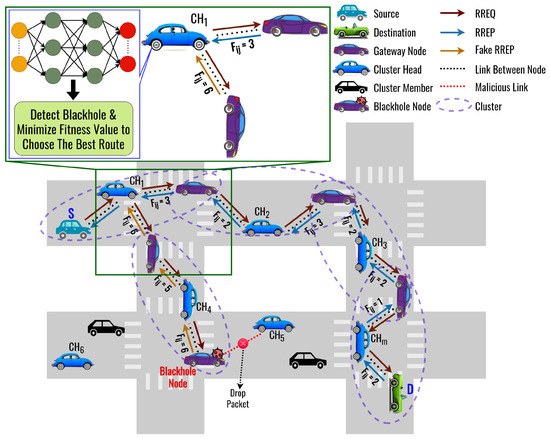 The proposed routing protocol is called the DLSR protocol. We assume that the clustering process has already been completed and is running periodically during the routing process. Figure 4 shows an illustration when a blackhole node appears in the network. Each node employs DL to detect the presence of a blackhole node. If a blackhole node is identified along the route, then the fitness value will have a higher value than the other route, and secure routing is employed to avoid it. The flowchart of the proposed DLSR protocol is shown in Figure 5, which can be divided by the route request process and the route reply process.