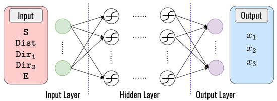 - Step 5.1: If node receives multiple CHI packets, it selects the CH among the CH candidates to follow based on the maximum fitness function value. Input parameters such as cosine similarity, cosine distance, and remaining energy are taken into account. The proposed fitness function can be expressed aswhere , and are the cosine similarity, cosine distance, and remaining energy, respectively. Equation (2b) indicates the total weight that must be equal to one. Furthermore, (2c) explains that the cosine similarity must be greater than equal to the cosine similarity threshold, (2d) explains that the cosine distance must be lower than equal to the cosine distance threshold, and (2e) explains that the remaining energy of the CH must be greater than equal to energy threshold, respectively. To find the optimal weight in (2b), we use the proposed DNN model, which is elaborated on in detail in the forthcoming Section 4.1. Using a DNN model to optimize the weights of a fitness function can provide a more efficient and accurate solution compared to iteration-based algorithms, especially when dealing with large-scale, high-dimensional, and complex problems. Moreover, the iteration-based algorithm spends so much time finding the optimal weights compared to the DNN model. This efficiency can lead to reduced delays in the optimization process and ultimately improve the performance of the overall system. Here, we consider cosine similarity, which serves as a measure of similarity between the movement patterns of vehicles. Vehicles with high cosine similarity have similar movement patterns and, therefore, can be grouped together in the same cluster. The cosine similarity between two nodes can be defined as [36]where and are the and node’s vector information list, respectively. Each node is associated with vector information metric values such as speed, direction, and location. It can be defined as , where indicates a value that denotes the association between nodes. Furthermore, we consider the cosine distance between mode and its neighbor. We may control CM to create a more stable CM from the perspective of mobility by taking into account the highest cosine similarity under the constrained communication distance. Therefore, the cosine distance can be defined as [37]Here, we also consider the remaining energy of the node. By considering the remaining energy, we can design energy-efficient clustering protocols that take into account the energy consumption of nodes, ultimately prolonging their lifetime. To establish an accurate and reliable energy model, we reference the work of [7,8], which provide comprehensive insights into energy-efficient approaches in wireless networks. Then, the selected CM can be mathematically formulated aswhere indicates the fitness function value of node , and indicates the fitness function value of neighbor CH near node and goes to Step 5.2.
