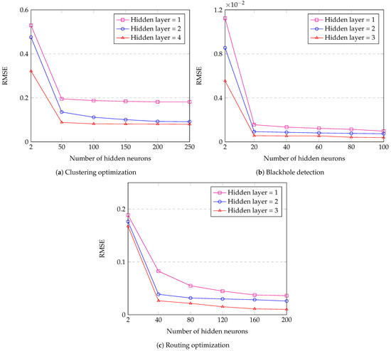 - We design the DNN model to optimize the fitness function in both the routing and clustering process. By using DNN, the proposed DLSR protocol can optimize the weights of each parameter, such as remaining energy, distance, and hop count, which leads to choosing the best route against blackhole attacks; while in the DLC protocol, DNN is used to optimize the weights of each parameter, such as cosine similarity, cosine distance, and remaining energy, which leads to electing CH.