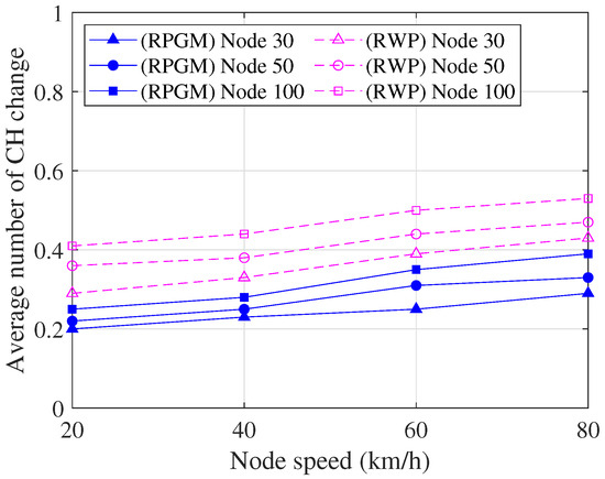 Figure 13 shows the comparison of the average number of cluster head changes per session as a function of node speed, serving as an evaluation of cluster stability. From Figure 13, it is evident that as the node speed increases, the average number of cluster head changes also increases. This can be attributed to the frequent changes in node location due to the higher speeds, resulting in disruptions to the clustering process. Furthermore, as the number of nodes in the network increases, the average number of cluster head changes also increases. This can be attributed to the higher network density, which leads to more frequent changes in cluster heads. In addition, we are evaluating the effect of the mobility model (RPGM and RWP) on the average number of cluster head changes within the network. As we can see in Figure 13, the RPGM model exhibits a lower average number of cluster head changes compared to the RWP model. The reason is that in the RPGM model, vehicles move cohesively in groups, which means they tend to follow similar trajectories and move together as a unit. On the other hand, in the RWP model, vehicles move randomly and independently, each following its own trajectory without any coordination with other vehicles. Thus, the RPGM model performs more stable and cohesive clusters, resulting in a lower average number of cluster head changes compared to the RWP model, where vehicle movement is independent. However, it is important to note that the average number of cluster head changes remains less than one. This indicates that, on average, there is less than one cluster head change in each session. Hence, the proposed clustering algorithm demonstrates a high level of stability as the number of cluster head changes is kept minimal.