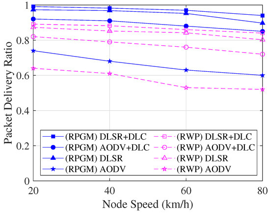 The comparison of the PDR as a function of node speed is shown in Figure 14. The PDR decreases as the node speed increases. The possible reason is that the network becomes more unstable since the node is more dynamically moved when the node speed increases, leading to the occurrence of packet loss. However, we can see that the DLSR with DLC (DLSR+DLC) protocol has a markedly higher level of PDR than other protocols. As a result, the DLSR with DLC protocol turned out to be the most reliable in terms of PDR. In addition, the DLSR+DLC protocol with the RPGM model shows a high PDR compared to the RWP model. The reason is that RPGM provides a more controlled and structured mobility pattern, leading to better communication and more stable network connectivity compared to RWP.