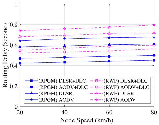 Figure 15 compares the routing delay, which includes the consumed time for cluster construction per session as a function of node speed. As we can see in Figure 15, when node speed increases, the delay increases as well. The reason is that when the speed increases, frequent network topology changes lead to frequent interruptions in data transmission. Again, the protocol functioning under the RPGM model proves to be more stable than that under the RWP model. The reason is that the coordinated group movement in RPGM minimizes abrupt shifts in the network topology, consequently reducing the delay in establishing routes. Conversely, CH and GW are the only nodes involved in the proposed DLSR+DLC protocol, which leads to enhancing the efficiency of the routing process. Thus, the DLSR+DLC protocol with the RPGM model can transmit packets with the least amount of delay compared to other protocols.