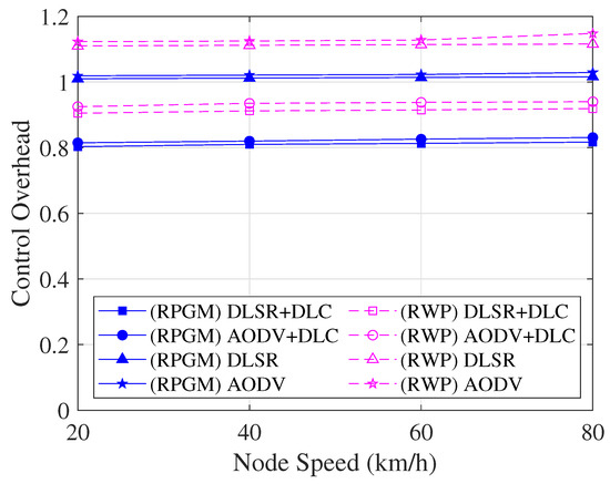 The control overhead, which includes the control overhead for cluster construction, is compared as a function of node speed in Figure 16. As we can see in Figure 16, the control overhead slightly increases as the speed increases. The reason is that when the number of node speeds increases, nodes can be broken more easily, leading to an increase in the control overhead. Furthermore, when comparing the two mobility models, it is clear that the RPGM protocol shows lower control overhead due to high stability than the RWP model. In contrast to other scenarios, the control overhead in our proposed routing protocol can be decreased by the DLC protocol. The decrease in control overhead is significantly lower in the case of the DLSR+DLC protocol than in other scenarios, as the DLC protocol only involves CH and GW nodes in the routing operation. Thus, it was shown that the DLSR+DLC protocol with the RPGM model may increase connectivity while simultaneously being the most stable in terms of control overhead.