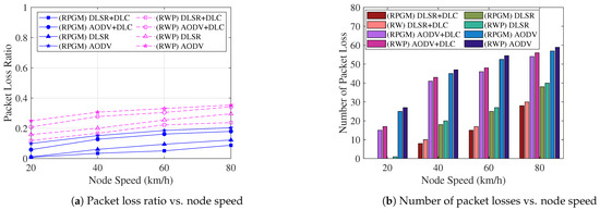The focus of our attention is now on security issues. In order to evaluate the impact of node speed on the network performance, we conduct a comparison analysis of the packet loss ratio and number of packet losses under various scenarios, as shown in Figure 17. Figure 17a displays the average packet loss ratio, which is calculated as the ratio of the number of loss packets to the total number of sent packets. It is evident that when the node speed increases, the average packet loss ratio also increases. Similarly, in Figure 17b, when the node speed increases, the average number of packet losses also increases. The observed behavior can be attributed to the increased node speed, causing the node’s location to change more frequently. Consequently, packets are more likely to be sent directly to the blackhole node, resulting in a higher packet loss rate. On the other hand, by using the RPGM model over the RWP model, we can handle movement-related issues better. The RPGM model ensures the predictable and collective movement of nodes. Thus, the RPGM model leads to fewer route changes, more stable connections, and ultimately, a lower chance of packet loss. However, clustering plays a significant role in reducing the number of links between nodes. Therefore, the proposed DLSR+DLC protocol under the RPGM model showcases enhanced network security, making it a promising and effective approach from a network security perspective.